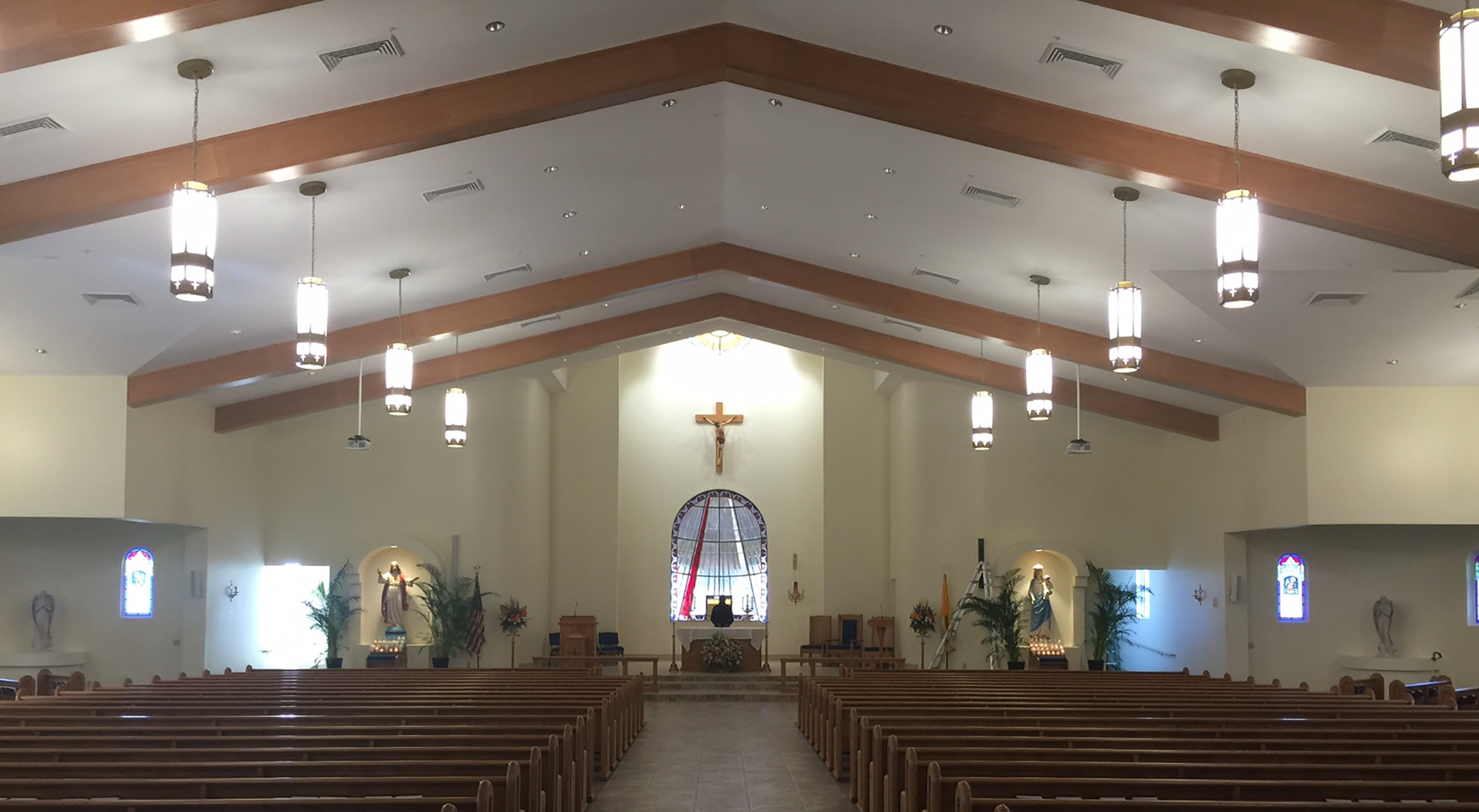 A new 13,400 square foot church building, including a sanctuary, chapel, and choir loft. The exterior of the building features a working bell tower and stucco scored to mimic stone veneer. The interior includes vaulted ceiling and stained wood beams.